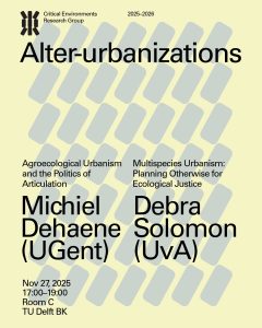 The Critical Environments lecture series explores the agency of design as a mode of investigation and reflexive transformation of the ever-changing interrelations between natural processes, societal practices, and (geo)political frameworks. For 2025, the series is framed under the theme of Alter-Urbanizations: explore alternative modes of human and more-than human coexistence, enabling the realization of potentials for inclusive development, political emancipation, ecological justice, and plurality across scales. The second event in the series invites Michiel Dehaene and Debra Solomon in a conversation on the prospects of incorporating agroecological and more-than human perspectives in alternative forms of urbanization.